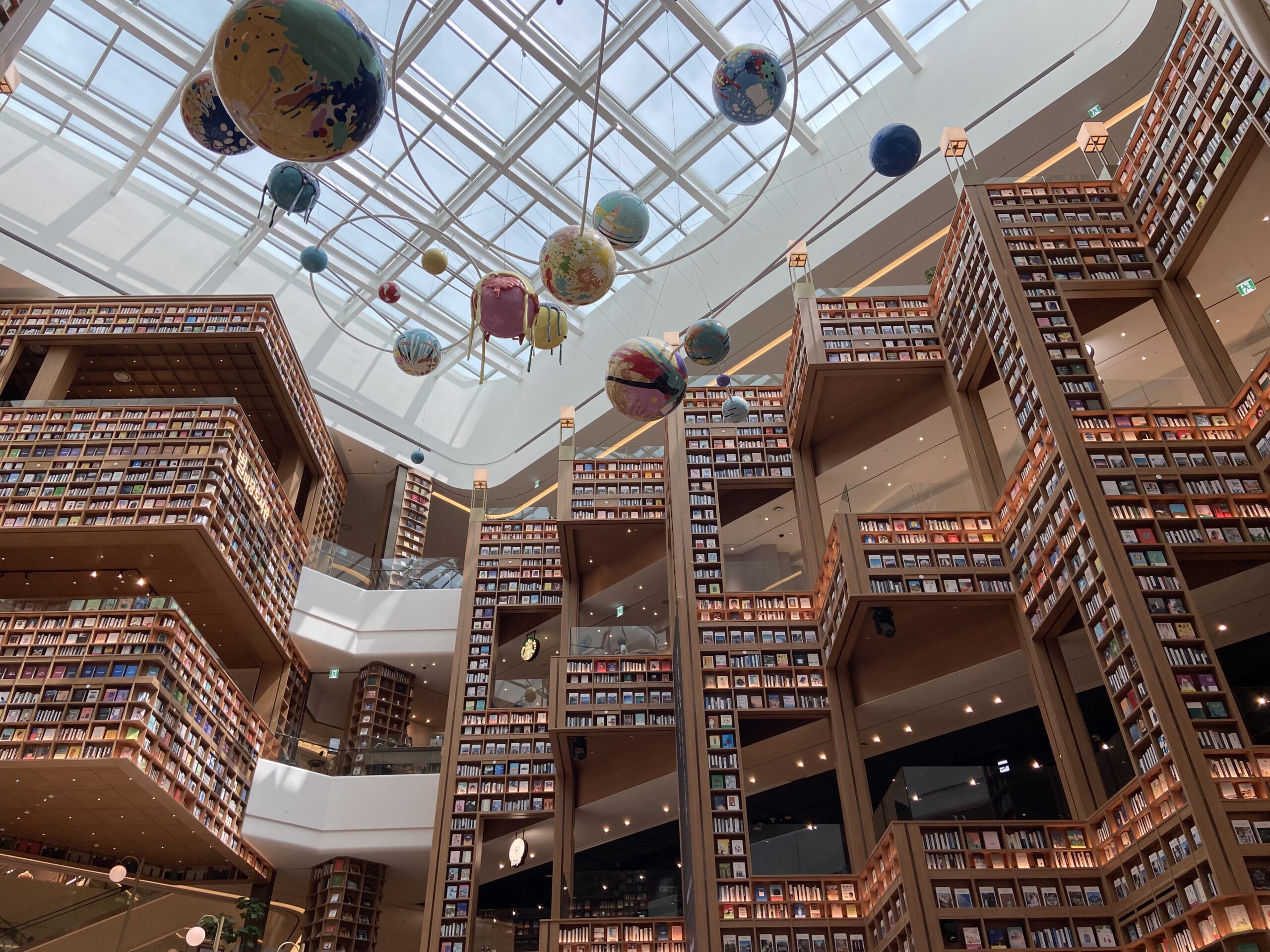 今回お届けするのは、ソウル中心部から少し離れた、京畿道・水原(スウォン)にある最新の大型ショッピングモール、「スターフィールド水原(스타필드 수원)」内に誕生した「ピョルマダン図書館(별마당 도서관)」です。ピョルは星、マダンは庭という意味で星の庭という意味になります。ここの図書館は壮大な本の配置、4階から7階まで続く吹き抜け、惑星をモチーフにしたカラフルな装飾など、まるでアート作品を見ているようです。ソウルにもピョルマダン図書館があるのですが、本日は水原のほうをご紹介しますね。